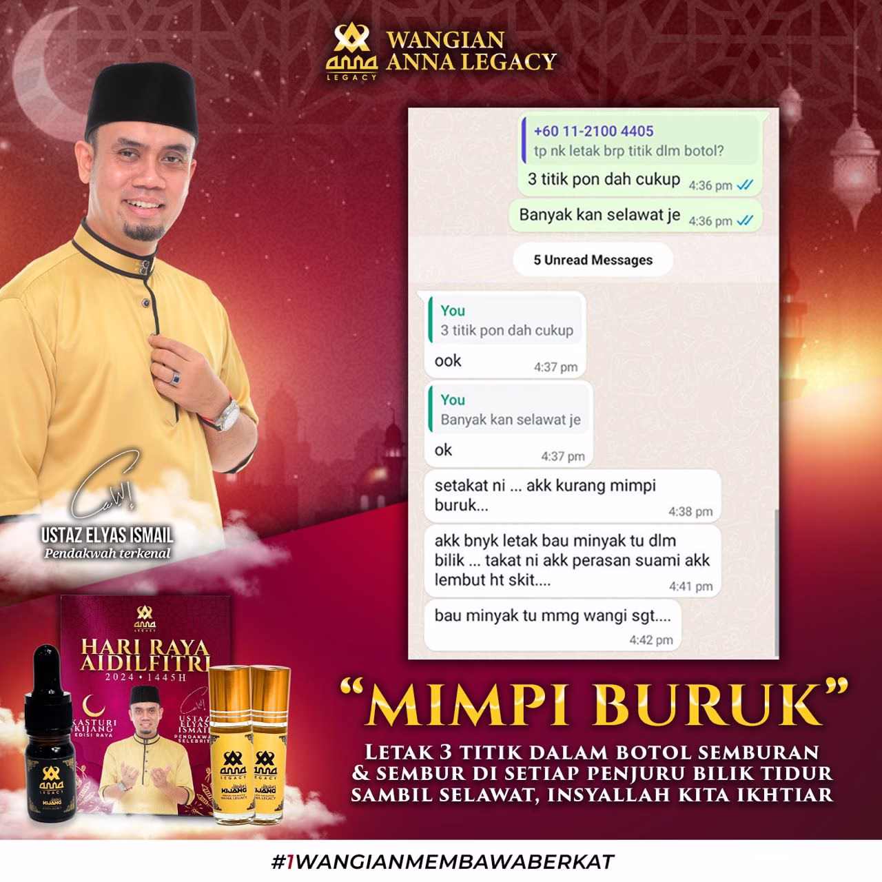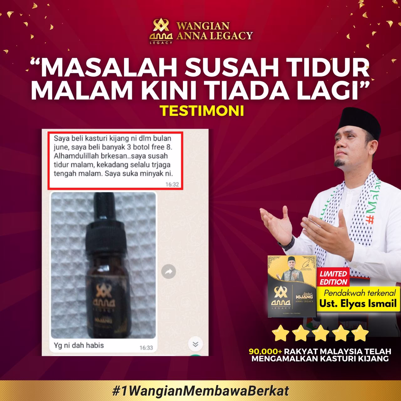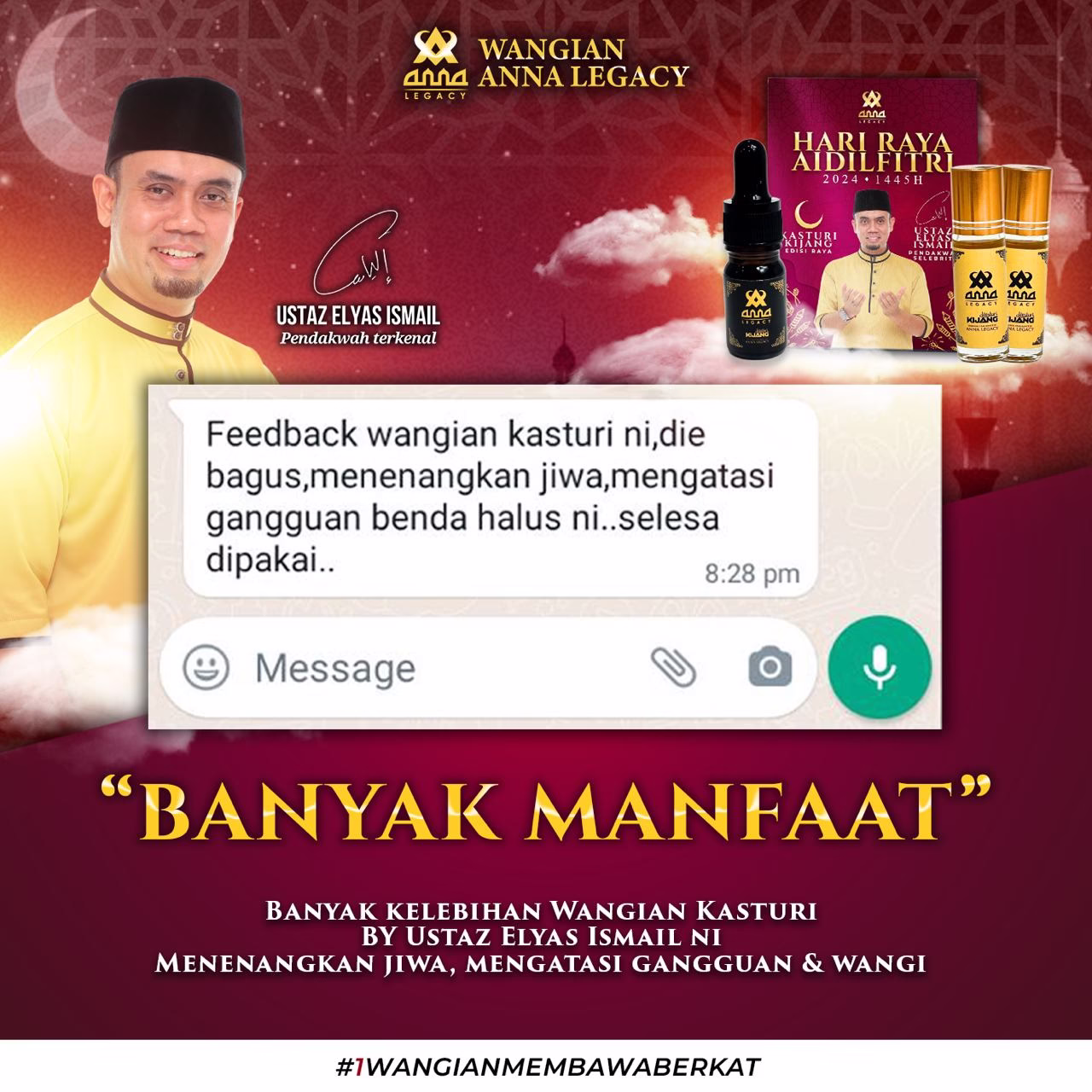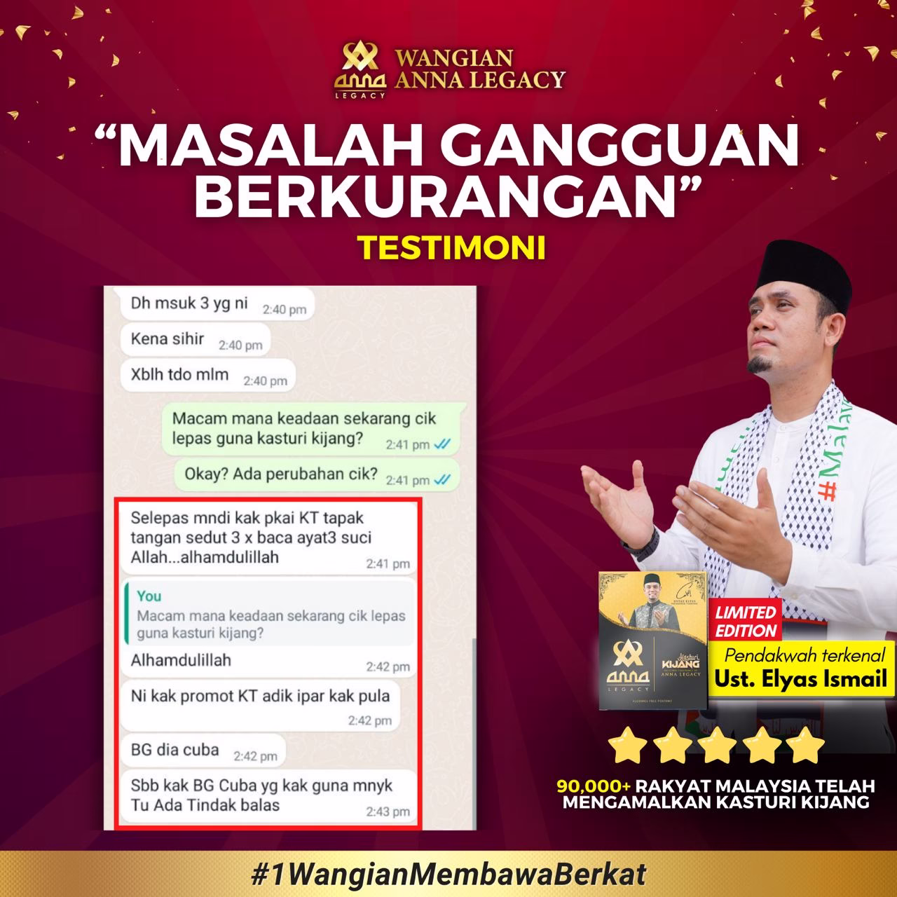 Produk ini adalah ikhtiar yang menggunakan wangian sunnah Kasturi Kijang yang didoakan dengan ayat-ayat ruqyah dan amalan Islam. Ramai pengguna berkongsi kesan positif seperti tidur lebih lena, rumah kembali tenang, dan anak-anak tidak lagi menangis waktu malam.